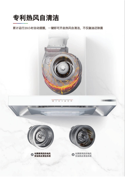 除了強(qiáng)大的吸油煙能力,博世致薄5D環(huán)吸凈煙機(jī)還搭載了專利熱風(fēng)自清潔技術(shù)。這一創(chuàng)新設(shè)計(jì)通過(guò)內(nèi)部加熱裝置,將油污高溫軟化并隨氣流排出,有效解決了傳統(tǒng)油煙機(jī)難以清洗的難題。用戶無(wú)需頻繁拆機(jī)清洗,大大節(jié)省了時(shí)間和精力,讓廚房清潔變得更加省心省力。