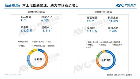 奧維云網(AVC)監測數據顯示,2024年洗碗機線上市場新品數量91個,線下新品數量123個,僅從新品數量來看,今年上半年的新品數量產品類型較去年同期都有所減少,但線上新品零售額4.5億元,新品銷售規模占比提升1.2%;線下新品零售額8千萬,新品銷售規模占比提升4.2%。這種增長反而說明2024年新品和新技術的認可度較高,創新力和產品迭代更新效率上進一步提高。