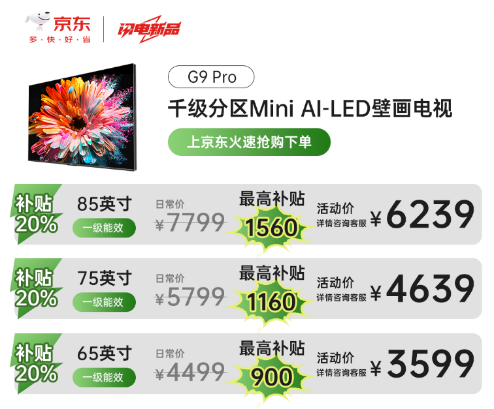 節(jié)能補貼活動期間,康佳電視特別推出了新品G9 Pro Mini AI-LED壁畫電視作為本次活動的主打產品,引領綠色節(jié)能新風尚。這款電視搭載前沿的Mini AI-LED分區(qū)控光技術,1920個獨立控光分區(qū)配合AI激光控光芯片,實現像素級精準控光,每一幀畫面都層次分明,色彩鮮活。外觀設計上,85/75/65英寸全面屏設計,一體純平貼墻如同藝術壁畫,不僅提升了觀看體驗,更完美融入現代家居環(huán)境,彰顯品味與格調。