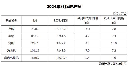 8月全國冰箱產量897.7萬臺,同比增長4.7%;1-8月累計產量6781.6萬臺,同比增長7.3%。