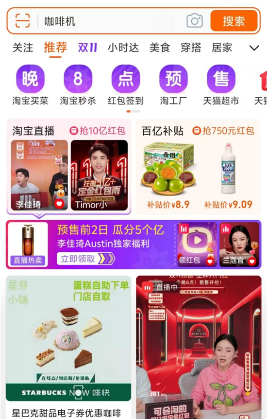 在14日以直播為宣傳重心之后,15日淘寶將APP首頁通欄從直播,換成了家電,在“天貓雙11家電搶先購”之外,用更大的字體標出“疊加政府補貼6.2折起”。
