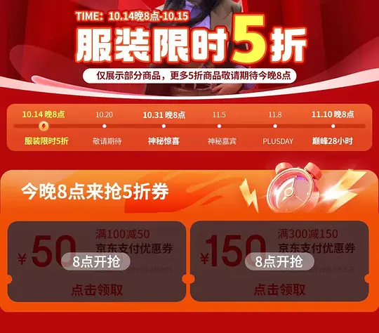 那我們為什么將這個活動歸納在京東的雙11范疇內呢?因為在10月14日,京東再次發放了同樣的支付優惠券,根據活動頁面,該“服飾限時5折”活動在雙11活動表中,換言之,之前的活動更像是一場預熱,也似乎是對全新支付券的一次試水。 在5折服飾節之外,京東在下半年還新增了黑色星期五和超級京東超級18。