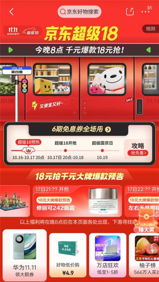 同時,自10月12日起,京東還預熱了一款名為“京東超級18”的活動,活動分為10月12日-16日和10月15日-11月11日兩波,以回饋PLUS用戶為目的,其中,17和18日被稱為超級18開搶。在以往品類主題日、超市主題日、百億補貼日、國際商品主題日等中,硬生生創造出了新的記憶點。也有網友認為,此后,每個月18日的時間節點可能將會被京東沿用下去。