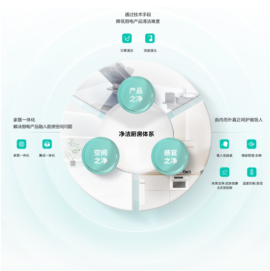 此外“凈潔廚房”的代表產品之一“凈白套系”最大設計特點是從Z世代喜歡的干凈治愈色彩心理學出發,融合工業設計美學,用“凈白”色調的高端廚電,為現代家庭重新定義“凈潔的廚房空間”。從視覺效果上,安裝“凈白套系”的廚房似乎真的自帶“好清潔”屬性。其整體采用潔凈的純白主色調,還能更好地融入我們追求的家居風格中。