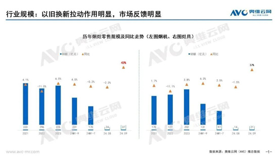 隨著消費品以舊換新政策的深化推進,各地家電零售渠道迎來前所未有的繁榮景象,國補政策在消費群體中的認知度不斷擴大,更多的換新需求和縣域下沉需求不斷涌現(xiàn)。奧維云網(wǎng)(AVC)數(shù)據(jù)顯示,2024年1-9月我國油煙機市場累計零售額為231億元,同比增長4.5%;灶具市場累計零售額為131億元,同比增長6.3%,其中政策促進作用明顯。