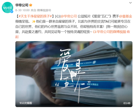 2005年至今,華帝通過“紅領巾1+2”助學項目等公益項目,為困境中的兒童和青少年送去多重關愛。2024年8月,華帝攜手壹基金共同啟動「天生干凈星星的孩子」孤獨癥家庭守護計劃,項目首期資助了14所“家長加油站”,幫扶對象覆蓋700多個孤獨癥家庭。華帝董事長兼總裁潘葉江也以個人捐款的方式積極支持這一公益活動。同期拍攝的公益短片《愛是“五仁”》總曝光量超過2600萬,有效吸引了更多社會力量加入到對這一特殊群體的關注和幫扶中。