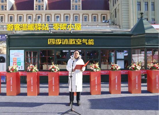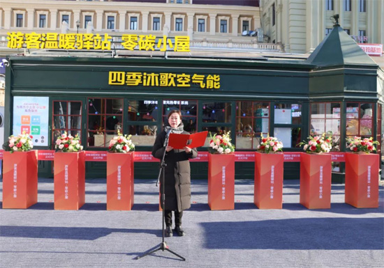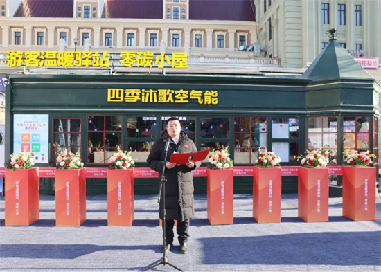 四季沐歌集團總裁李駿在儀式講話中指出,此次將溫暖驛站升級為溫暖驛站零碳小屋,一是希望全方位發揮窗口示范作用,以熱情周到的服務為每一位游客驅散寒意、送上暖意;二是為踴躍投身公益的青年志愿者搭建平臺,公益之心在此匯聚;三是將其作為廣大青少年探索環保知識、踐行低碳理念的科普實踐基地,將哈爾濱整座城市堅持綠色低碳發展的理念傳至五湖四海。