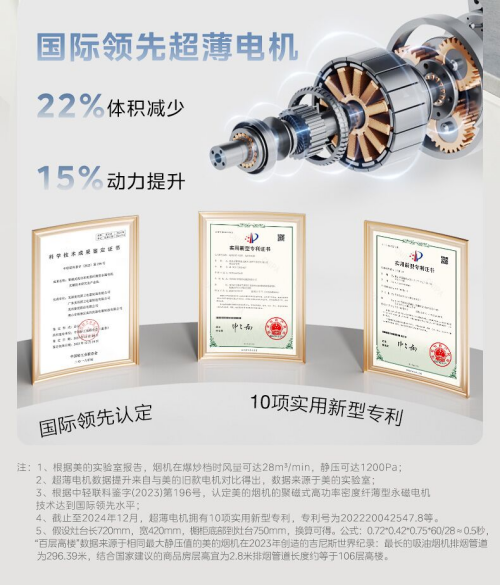 從技術層面來看,美的超薄電機采用了多槽極切向永磁電機技術,相比上一代電機,功率密度提升了25%,力矩提升了20%,體積減少了22%,但動力提升了15%,吸力達到了28m³/min,風壓達到了1200Pa,0.5秒即可煥新烹飪區空氣。