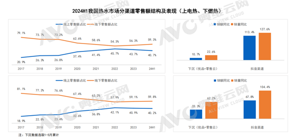 在線上市場,品牌借助電商平臺及直播帶貨等新型營銷途徑積極拓展其市場份額。奧維云網(AVC)數據顯示,2024年上半年,電熱抖音渠道銷售額同比增長了113.4%,銷售量同比增長了127.6%;燃熱抖音渠道銷售額同比增長了67.8%,銷售量同比增長了104.4%,實現顯著躍升。