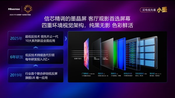 在屏幕創新上,海信小墨E5Q Pro墨晶屏解決了傳統電視受環境光干擾的痛點。普通電視屏幕容易受眩光、倒影影響,霧面屏則存在透光率低、視角狹窄等缺陷。墨晶屏通過四重技術架構實現全新突破:低反層與防眩層組合將反射率壓至2.6%,純凈黑度較行業均值提升100%;STW視角補償層確保178°廣視角下色彩一致性。負性液晶技術令透光率與響應速度同步提升,色彩表現增強54%。這一組合使電視在強光環境與多角度觀看場景中均能呈現穩定畫質。