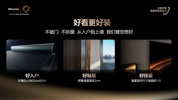 為解決家庭環境光干擾難題,海信歷時五年研發出納米光譜選擇屏Pro。該屏幕歷經1100余次實驗、測試820塊膜片,最終實現全屏穩定亮度1000nits(傳統液晶電視僅為500nits),環境光遮蔽率高達87%。無論是白天的強光環境,還是夜晚的暗光場景,畫面均能保持高亮通透。此外,探索X1 Ultra屏幕支持可折疊設計,120英寸巨幕折疊后包裝僅1.7米,輕松入戶。0貼墻安裝與20KG超輕重量(僅為同尺寸液晶的1/5),完美適配各類家居風格。