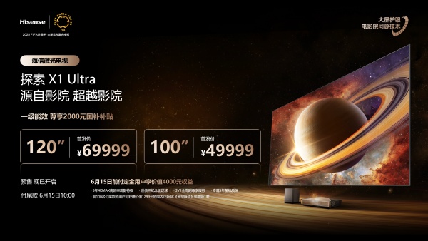 售價方面,探索X1 Ultra 120英寸首發價69999元,100英寸首發價49999元。探索X1 100英寸首發價34999元,92英寸首發價21999元。海信激光電視探索X1全系采用一級能效,國補后立減2000元。此外,海信還將在今年下半年推出探索X1 139英寸與150英寸版本,后者屏幕面積相當于半個標準羽毛球場,進一步拓展家庭影院邊界。