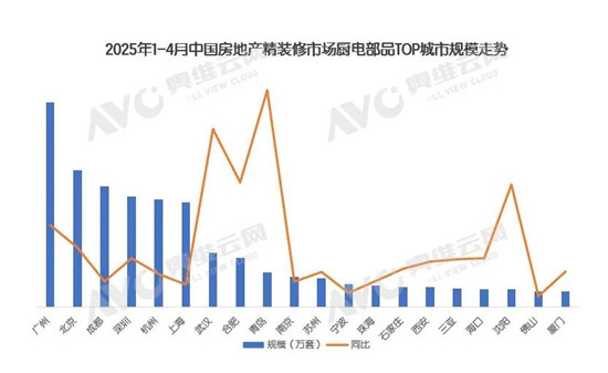 華南大區結構比逆勢增長,全國超五成城市規模增長從區域競爭結構來看,2025年1-4月精裝修市場配套廚電六件套中,主要以華南、華東區域為主,合計市場份額為68.4%,與去年同期相比,同比-1.0%,其中華南區域結構比逆勢增長,廣州、深圳、三亞等城市精裝規模增長帶動華南市場份額提升,市場份額為35.8%,份額上升6.8個百分比,規模為12.07萬套;從城市來看,2025年1-4月精裝修市場配套廚電六件套中參與精裝新開盤的城市有43個,雖然大盤下滑,但有22個城市規模呈現增長,其中一線城市中增長的有廣州、北京、深圳,規模同比分別為+74.5%、+26.6%、+3.9%;新一線城市中增長的有武漢、青島、沈陽、重慶,規模同比分別為+278.1%、+360.4%、+160%、+163.1%;二線城市增長的有合肥、海口、福州等7個城市,三四線城市增長的有三亞、茂名、韶關等6個城市,五線及其他城市增長的有萬寧、陵水。