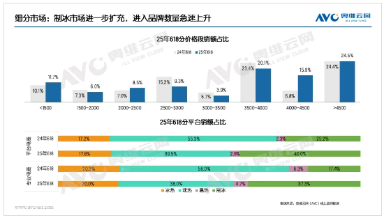 受國家補貼政策及創新功能驅動,2025年618期間凈飲機行業增長勢頭顯著。其中,制冰凈飲機成為市場新寵,市場份額快速提升,強勁拉動中高端價格段產品的銷售增長。消費者對凈飲機的需求已不再局限于單純的飲水功能,集制冰、加熱、凈化等多種功能于一體的復合型產品,正成為市場主流選擇。