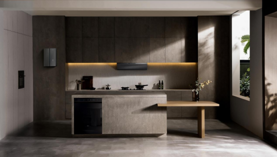 作為主打“廚房新美學”的油煙機,它以超薄機身實現(xiàn)“0縫齊平安裝”——可以與標準櫥柜完美貼合,徹底消除突兀感。搭配低調(diào)奢華的AG玻璃面板,煙機與櫥柜渾然天成,打造出“隱形煙機”的視覺效果,不僅適配現(xiàn)代簡約、輕奢風等多種裝修風格,更讓廚房從單一的烹飪空間蛻變?yōu)椤八饺嗣缹W空間”。