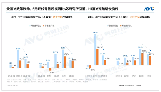 2025年6月,據奧維云網(AVC)監測數據,中國家電市場(不含3C)線上零售額同比增長12.2%,線下零售額同比增長24.8%,受國補政策波動,6月雙線零售規模同比較5月有所回落。從2025年上半年的數據來看,線上零售額同比增長14.0%,線下零售額同比增長21.9%,國補延續期整體增長良好。