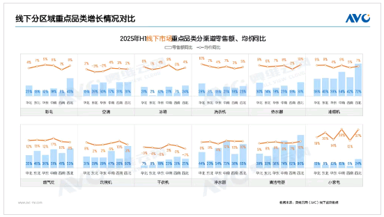 2025年上半年線下家電市場呈現多元分化格局,整體上西北、中南和華北地區的零售額同比增長靠前。區域層面,西北地區在黑白電、廚電、清潔電器等品類上都表現突出,這與大連鎖渠道加速布局該區域有關;華東和中南地區經濟發達,家電體量大,同期表現良好,用戶對品質升級的接受度更高,因此清潔電器、凈水器同比增長更高,同時一二線城市煙灶換新需求釋放也進一步拉動了該地區的煙灶增長。東北地區上半年冰洗品類增長低迷,華北地區在冰洗品類上增長較好,受7月大面積高溫天氣影響,這兩個地區的空調銷額同比出現不同程度暴漲。西南地區在清潔電器、空調、干衣機增長強勁。整體看,區域需求和品類發展不均,企業需精準布局,貼合各區域消費特點與品類增長趨勢。