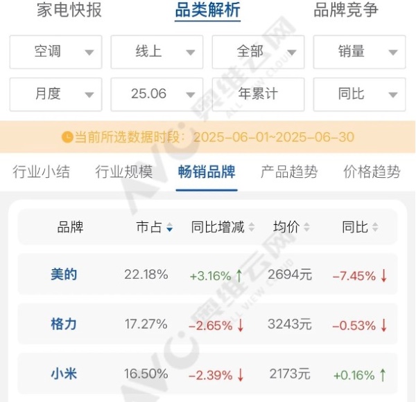 同期,奧維云網的數據顯示,6月格力空調在線上市場的占比下降至17.27%,小米則與格力的差距縮至不足1個百分點,即便面對小米線上份額升至第三、海爾卡薩帝高端收入激增50%的挑戰,美的空調仍實現了市場占比同比增長3.16%,以市場第一的成績持續領跑行業。