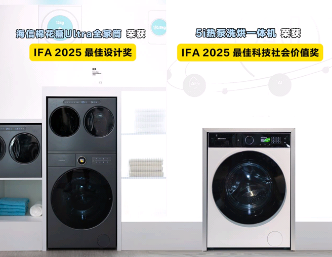 當全球消費電子行業的目光再次聚焦柏林,柏林國際電子消費品展覽會(IFA2025)不僅成為創新產品的秀場,更悄然變身為中國企業講述全球化進階故事的重要舞臺。9月5日,海信旗下三筒洗衣機——棉花糖Ultra全家筒迎來它的國際首秀,首次海外亮相便榮獲IFA 2025“最佳設計獎”,另一款海外熱銷產品5i熱泵洗烘一體機也因出色的節能與用戶體驗斬獲“最佳科技社會價值獎”。