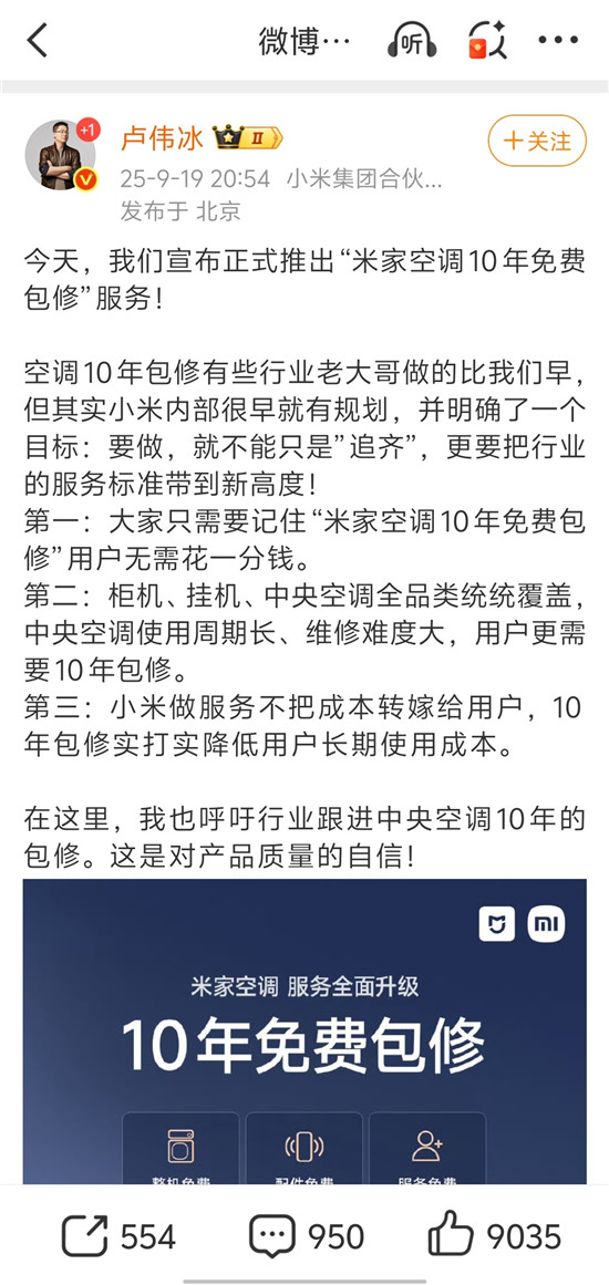 可能正是基于8月份的這場口舌之爭,在9月19日,盧偉冰在直播中宣布:小米空調正式推出十年免費包修服務。