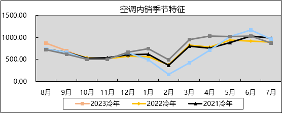 2023冷年累計(jì)家用空調(diào)生產(chǎn)3068.50萬(wàn)臺(tái),同比增長(zhǎng)0.62%,銷售3090.93萬(wàn)臺(tái),同比增長(zhǎng)2.18%,其中內(nèi)銷出貨2081.91萬(wàn)臺(tái),同比增長(zhǎng)7.84%,出口1009.02萬(wàn)臺(tái),同比下降7.82%。